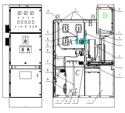 B-断路器室 4.主母线绝缘套管 10.零序电流互感器 16.断路器手车